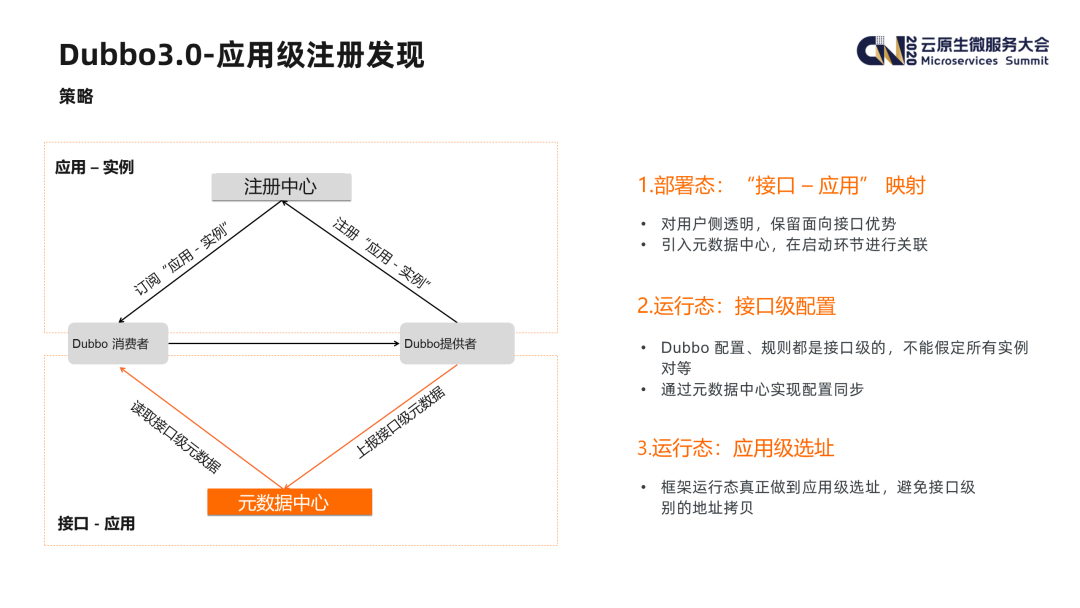 这里我们抽象出了元数据中心来管理接口到应用的映射以及应用级的元数据。在部署态,Dubbo 框架会自动上报这个关系到元数据中心。而运行态用户侧的配置和服务治理则通过这份映射关系重新将应用粒度映射到接口粒度。涉及到最核心的部分——选址也是分为两部分,应用级选址和接口级选址同时存在,方便进行服务治理。