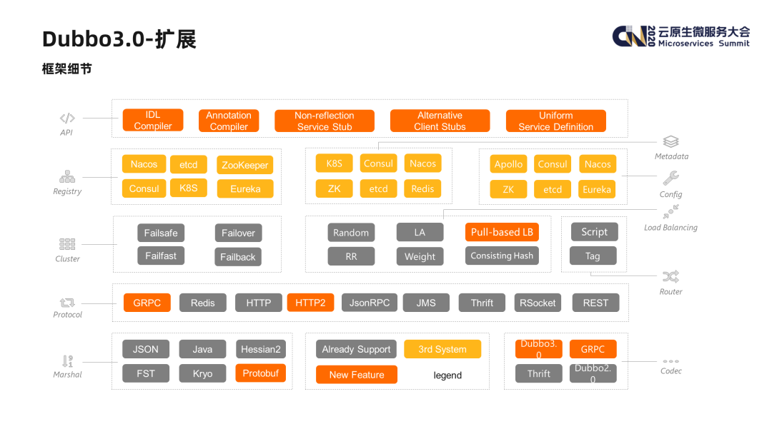 第二层是对于注册中心、元数据中心和配置中心的扩展。注册中心和配置中心基本支持了所有业界主流的实现,元数据中心是 Dubbo 2.7 新抽象出的组件,负责元数据的存取。这里的元数据包括服务的调用配置,如超时时间,序列化方式,协议等,以及对服务方法签名的抽象,方便 Dubbo 实现跨框架和跨语言调用。