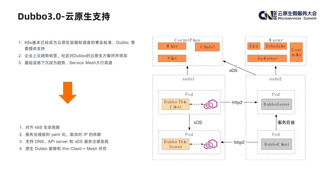 一是需要对齐 K8s 的生命周期,能够让 Dubbo 服务原生的在 K8s 体系内注册和发现;