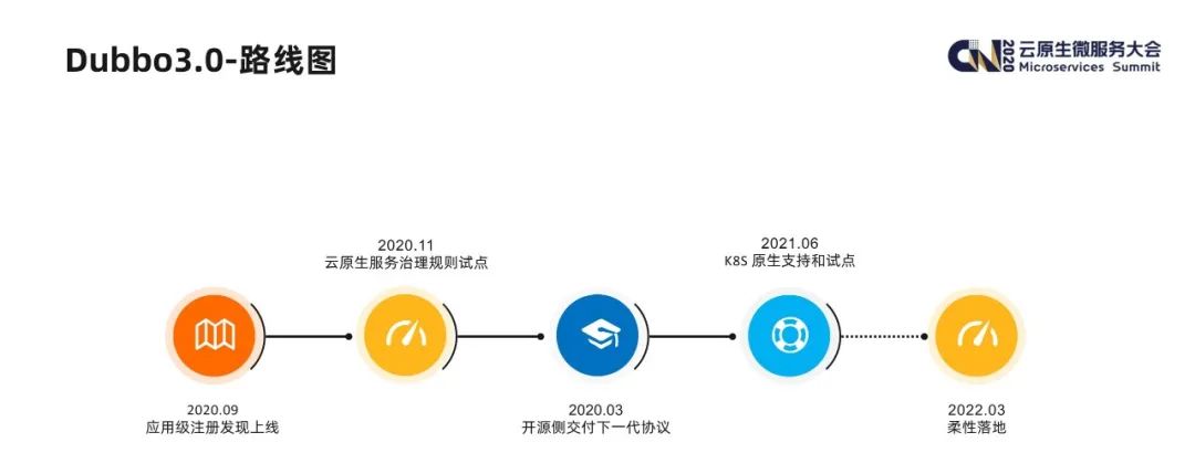 在接下来的 9 月份,应用级注册发现会同时在阿里巴巴内部和外部公司同时大规模落地。今年双十一前会交付云原生服务治理规则。到明年的 3 月份,开源侧的新协议支持功能基本完备。明年的 6 月份,云原生 K8s 的支持和 Mesh 支持功能完备,开始试点。柔性增强将在 2022 年的 3 月份全面落地,请拭目以待。