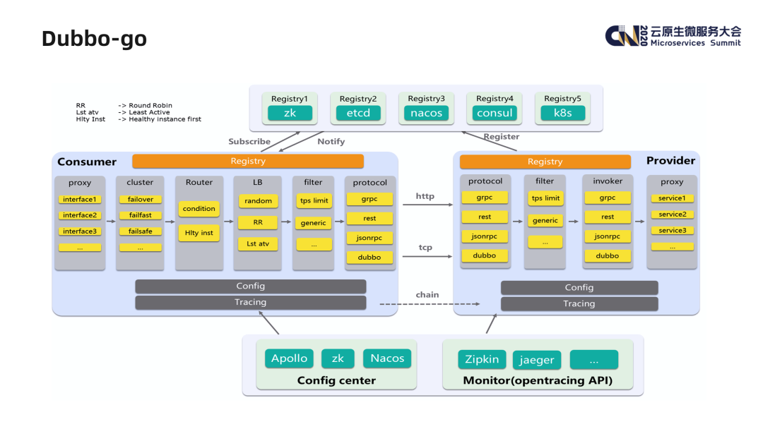看完了 Dubbo 3.0-java 的功能图,我们再来看一下 Dubbo-go 的功能图。可以看到,从分层到实现, Dubbo-go 已经基本和 JAVA 对齐,后面的 3.0 版本也会和 JAVA 齐头并进,共同迈向云原生。