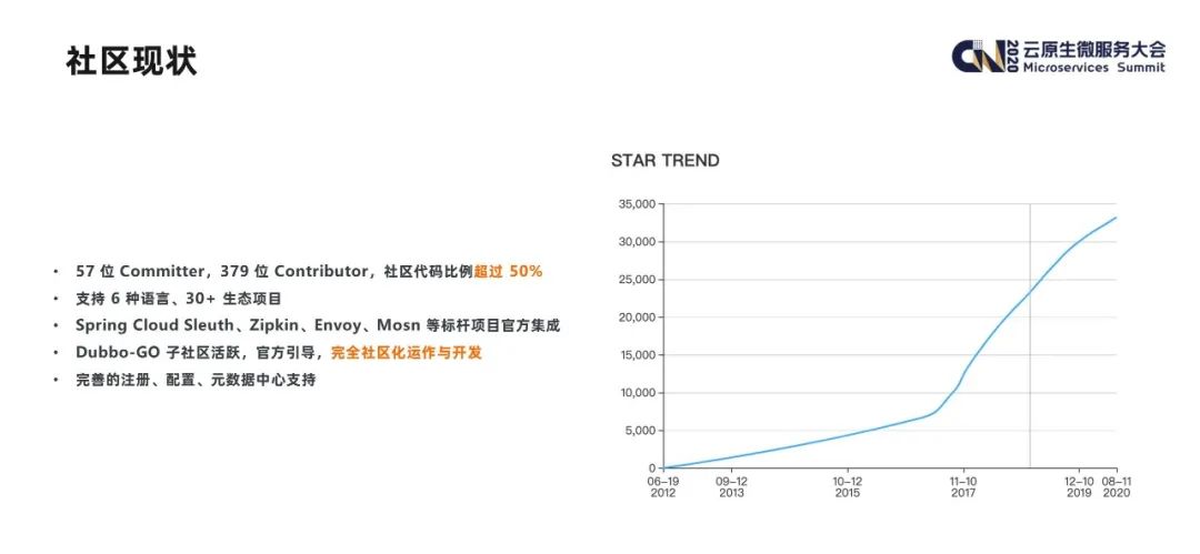 Dubbo 目前有 57 位 committer 和 379 位 contributor 。根据 X-lab 开放实验室最新发布的《2020 年微服务领域开源数字化报告》,Dubbo 的开源活跃度全球排名 693,在微服务框架中排名第五。整个社区蓬勃发展,来自外部的代码贡献量已经超过来自阿里员工的贡献量。也正是由于有这么活跃的社区,Dubbo 目前支持 6 种语言和 30 多个生态项目。