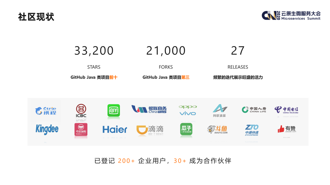 从数据上看, Dubbo 目前有 33k stars 和 21k forks,分别位于 github java 项目前十和前三,用户的认可带来了社区的活跃,而活跃的社区则会以高频率的版本更新带来更多新的、有用的特性来彰显其旺盛的活力。目前已经登记的 Dubbo 企业用户超过了 200 个,其中有 30 多个企业成为了 Dubbo 的生态合作伙伴。