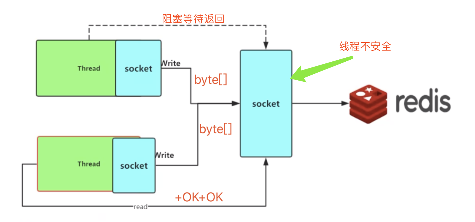 发现不但返回结果一次出现了两个甚至多个Redis服务其返回的OK,而且main方法还未执行结束。为什么呢,因为在多线程下Socket是线程不安全的,当多个线程访问Socket的时候,同时发送了请求,然后请求的返回结果会累积,然后被一个线程完全获取的情况,其余发送了请求的线程将一直阻塞等待返回,可是已经被先来的线程截取了流,因此程序无法继续运行。