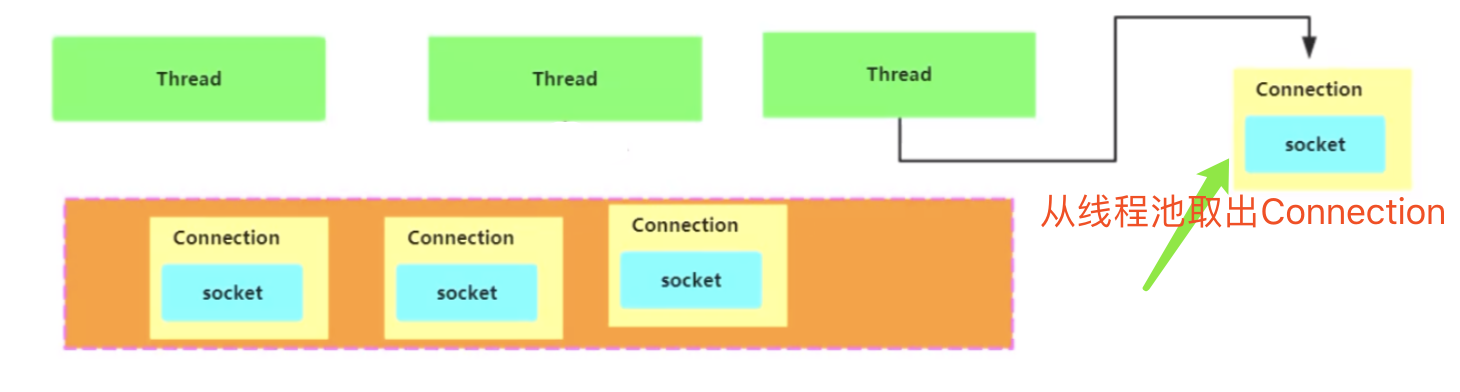 因此现在就需要一个线程池来管理Connection,每个线程使用一个单独的Connection,对于没有拿到Connection的线程就在阻塞队列等待,直到有线程完成调用,并将Connection释放回线程池,被阻塞的线程才继续进行调用。如下图: