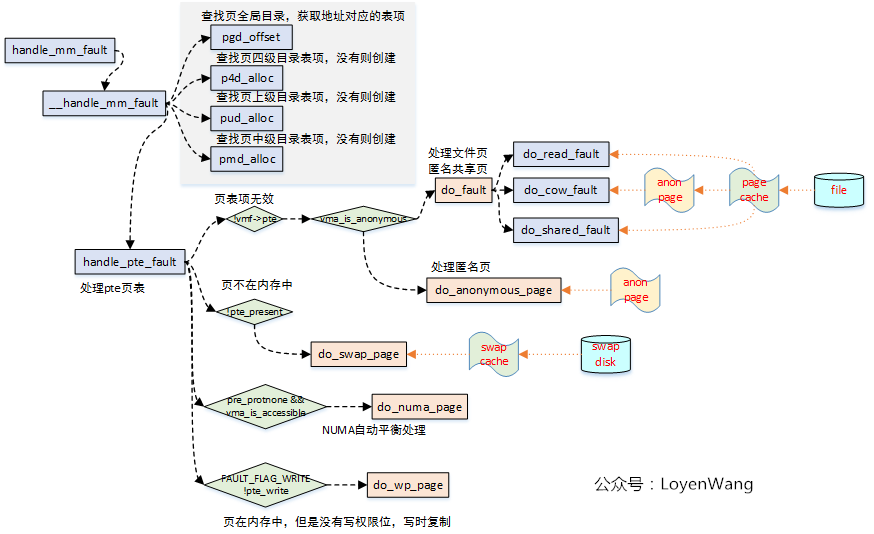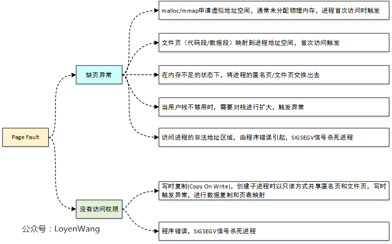 Linux内核中的Page Fault异常处理很复杂,涉及的细节也很多,malloc/mmap的物理内存映射只是它的一个子集功能,下图大概涵盖了出现Page Fault的情况: