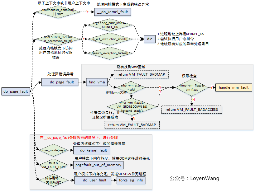 do_page_fault函数为页错误异常处理的核心函数,与体系结构相关,上图中的handle_mm_fault函数为通用函数,也就是不管哪种处理器结构,最终都会调用到该函数。