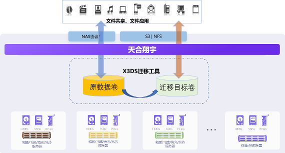 针对非结构化数据,天合翔宇提供X3DS立体数据管理系统,支持非结构化数据的复制、迁移、备份、归档功能;支持跨厂商的文件和对象存储之间数据相互移动,支持跨云的数据上云和下云。