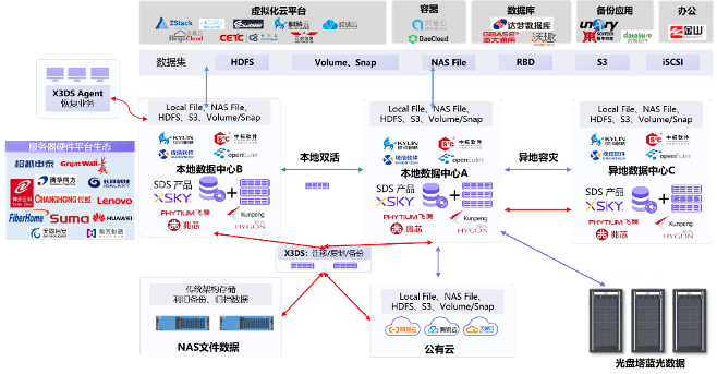可无缝对接信创生态的虚拟化云平台,容器,数据库,备份,办公等应用,满足本地到跨集群的数据容灾、迁移、备份,以及双活,两地三中心,海量非结构化数据一体化高速访问和长期存放等全业务需求。