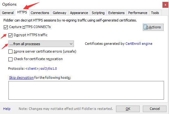 Fiddler在上面的设置下,加上:菜单栏Rules-->Customize Rules...-->重启Fiddler