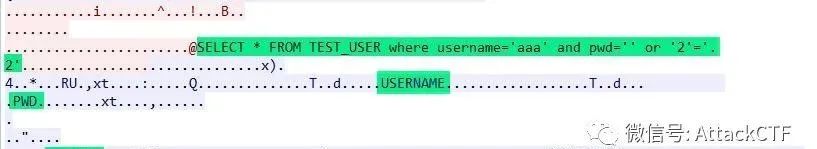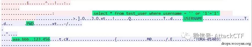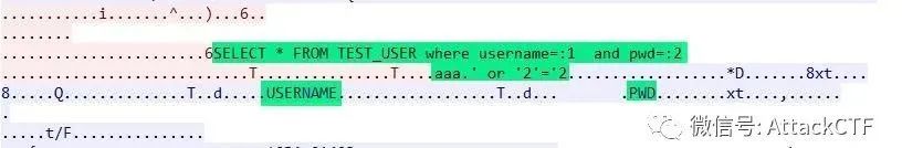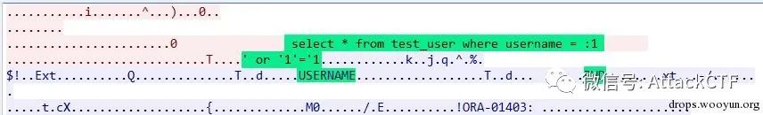 db.executeStatement("aaa", "' or '2'='2");对应的数据包如下,可以看到查询语句未使用oracle绑定变量方式,利用SQL注入查询到了数据。
