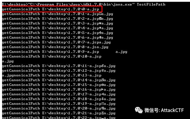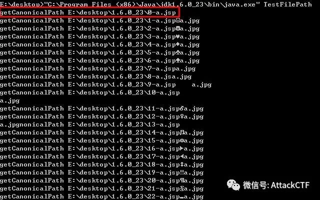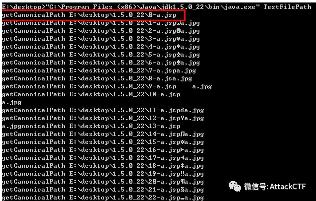可以看到使用JDK1.5执行时,除0x00外,冒号“:”(ASCII码十进制为58)也会产生文件名截断问题。