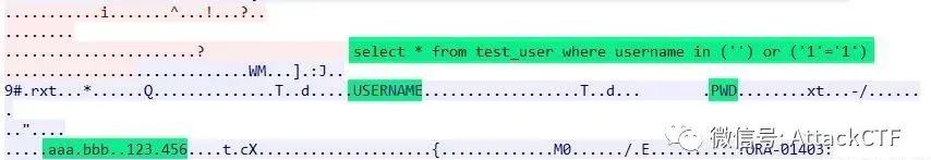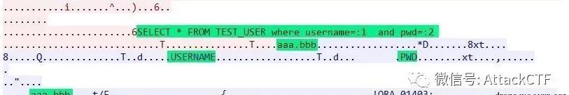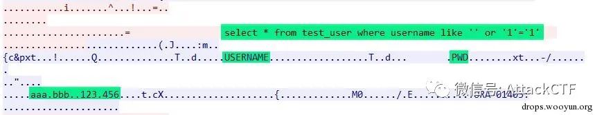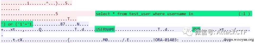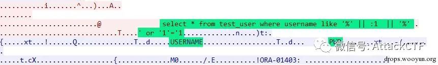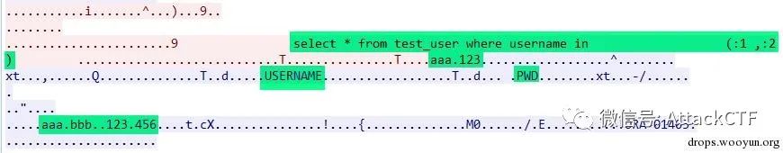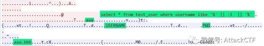 db.executePreparedStatement("aaa", "bbb");对应的数据包如下,可以看到查询语句使用了oracle绑定变量方式,使用正常查询条件查询到了数据。