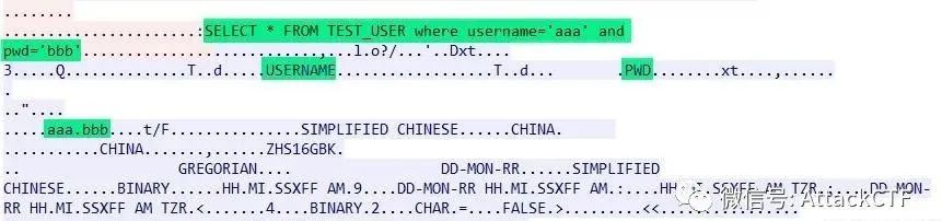 db.executeStatement("aaa", "bbb");对应的数据包如下,可以看到查询语句未使用oracle绑定变量方式,使用正常查询条件查询到了数据。