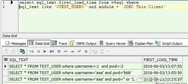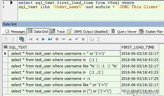 上述全部语句执行时在oracle的v$sql视图中产生的数据如下。