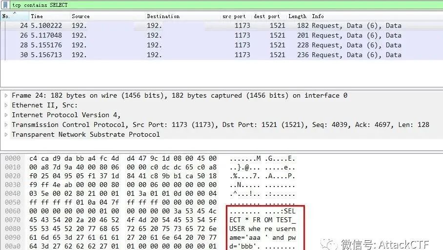查找select语句对应的数据包如下。