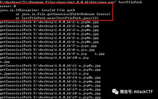 public static void main(String[] args) {String java_version = System.getProperty("java.version");String filename = "a.jsp#a.jpg";for(int i=0; i<=0xff; i++) {String filename_replace = java_version + "/" + i + "-" + filename.replace('#', (char)i);File f = new File(filename_replace);try {System.out.println("getCanonicalPath " + f.getCanonicalPath());} catch (Exception e) {System.out.println("error: " + i);e.printStackTrace();}}}