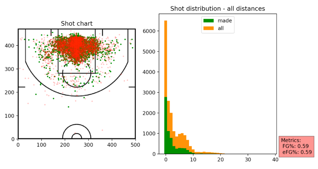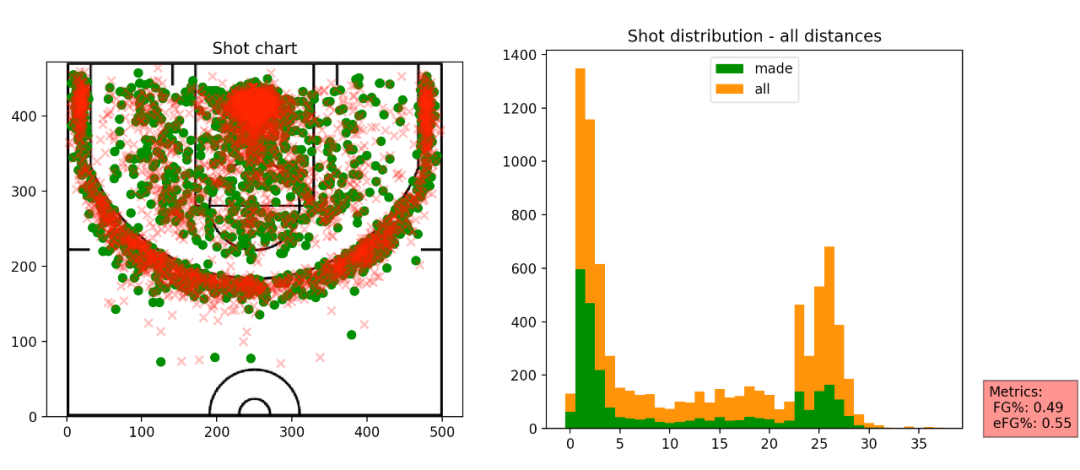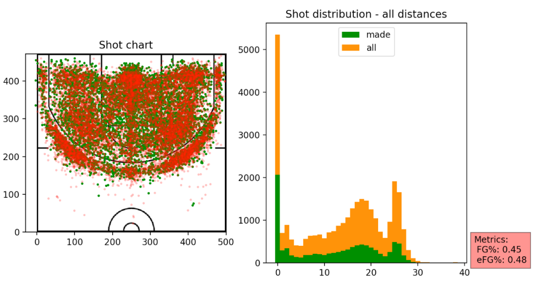 右边的图横坐标表示距离,纵坐标表示次数,绿色表示出手命中次数,橙色表示投篮出手次数。