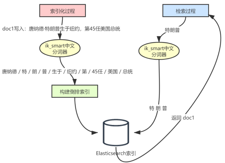 文档写入 Elasticsearch 不是直接写入,而是根据你Mapping定义的分词器(默认:standard)分词,构建倒排索引后写入。