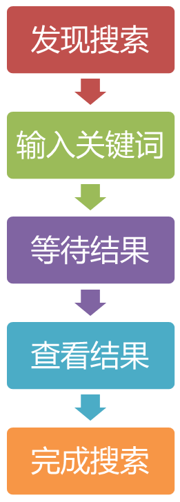 在搜索的过程中,用户的经历大致可以分为五个部分,分别是:发现搜索、输入关键词、等待结果、查看结果、完成搜索,每个步骤的体验都是整体体验的一部分,将对用户最终对搜索体验产生影响。