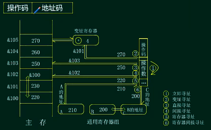 变址寻址:地址码+基址=真正的地址 &101+4=&105-->270