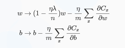 对于L2正则化:$C=C_{0}+\frac{\lambda}{2n}\sum_{i}\omega_{i}^2$,相比于未加正则化之前,权重的偏导多了一项$\frac{\lambda}{n}\omega$,偏置的偏导没变化,那么在梯度下降时$\omega$的更新变为: