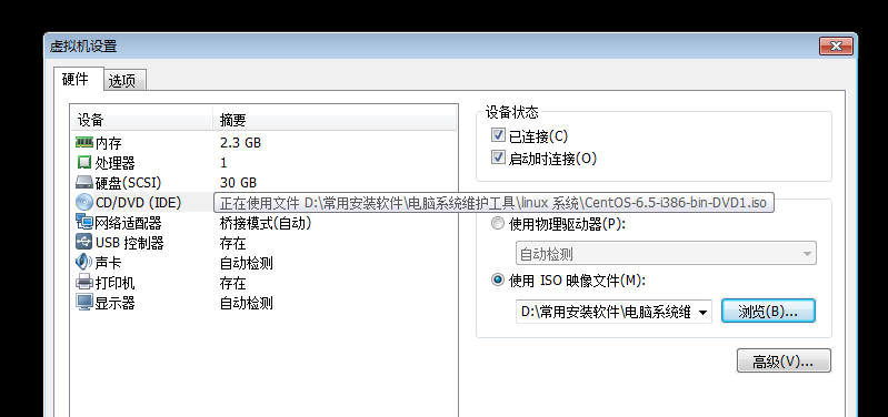 如果用的是VMware中的虚拟机,进入虚拟机设置,选择“CD/DVD”硬件,勾选“已连接”和“启动时连接”,在连接处,选择“使用ISO映像文件”,浏览选择本地电脑中下载好的ISO光盘镜像文件,确定即可。