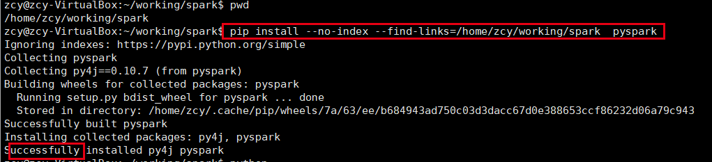2)安装:pip install --no-index --find-links=/home/zcy/working/spark pyspark