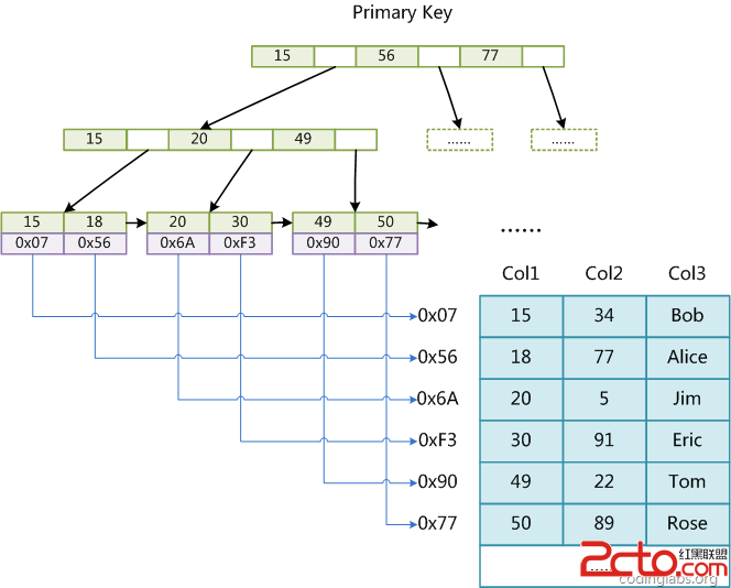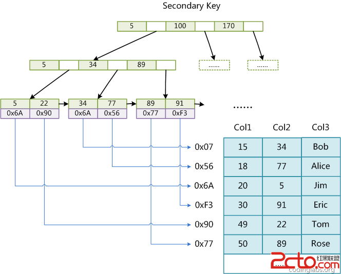 第二个与MyISAM索引的不同是InnoDB的辅助索引data域存储相应记录主键的值而不是地址。换句话说,InnoDB的所有辅助索引都引用主键作为data域。例如,下图为定义在Col3上的一个辅助索引: