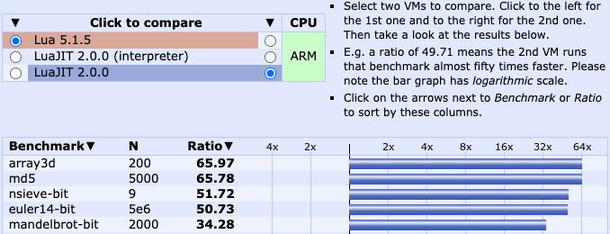 由于 LuaJIT 在开启 JIT 的情况下可以数十倍提升 Lua 代码执行效率[2],所以非常多游戏/框架都采用 LuaJIT 替代官方 Lua 虚拟机。