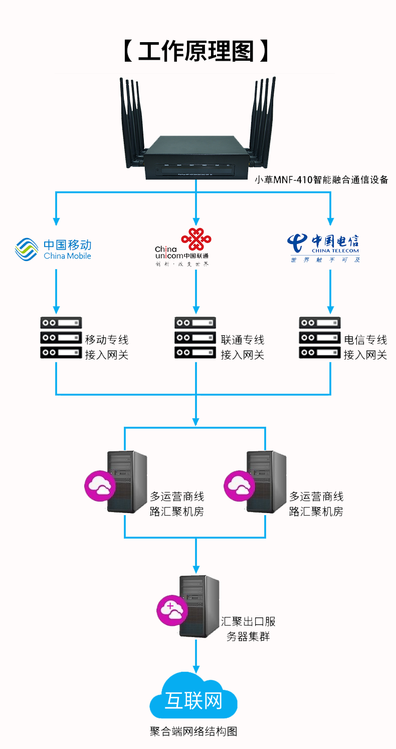 通过将多个有线和蜂窝网络资源通过通道连接同时结合,提供宽带功能,利用运营商多样性链路聚合和链路流控技术达到无缝故障切换,保障系统提供持续不间断的宽带服务。