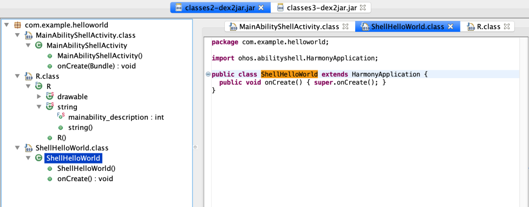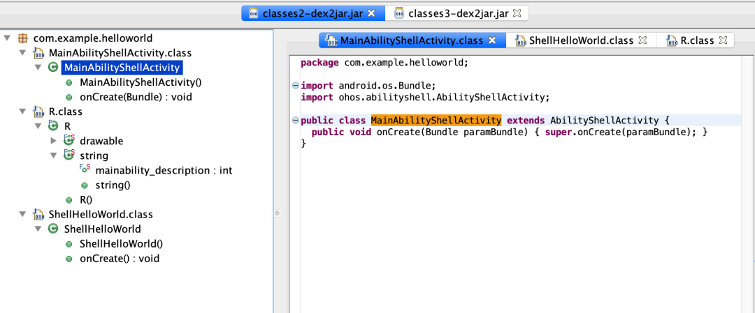 反编译该dex文件可以看到,MainAbilityShellActivity最终是继承了AbilityShellActivity: