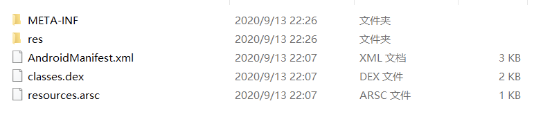下面我们来反编译apk文件,解压后可以看到,里面是我们熟悉的内容: