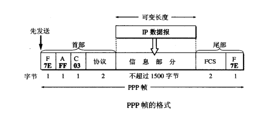- 首部中的地址字段A规定为0xFF(即11111111)、首部中的控制字段C规定为0x03(即00000011),这两个字段实际上没有携带PPP帧的信息