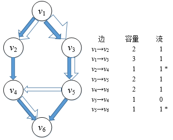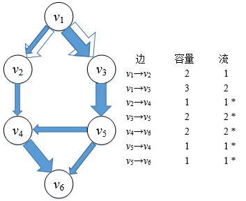 在图3中,边v2→v4的容量是1,流也是1,此时我们说这条边是满边,用星号表示满边的流值。边v1→v3的容量是3,流是1,说明这条管道并没有得到充分利用,实心箭头填充了管道1/3的空间。边v5→v4的容量是1,流是0,v5→v4处的开关是闭合的,这条管道处于闲置状态。