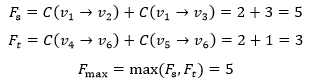 遗憾的是,这种方式是错误的,它忽略了其它边的容量,破坏了“流入等于流出”的守恒定律。以图4为例,C(v2→v4)和C(v3→v5)的总容量是3,不足以容纳5个单位的石油。换句话说,下游的容量制约了上游的生产力。