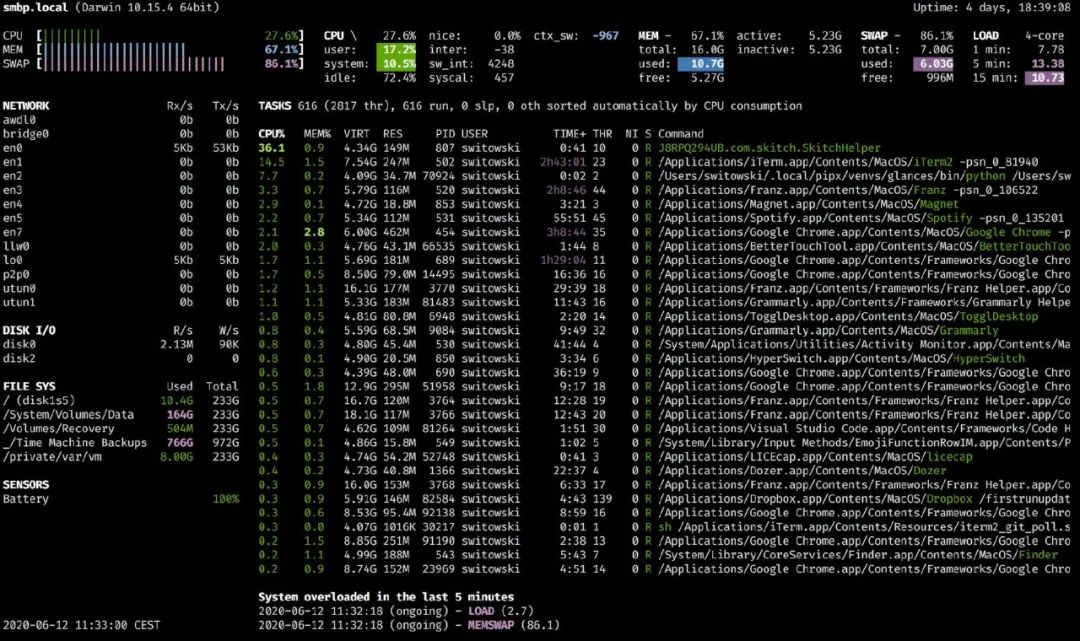 我选择使用htop来筛选和终止进程,因为对我来讲,效率提高了不少,我也使用 glances可以快速浏览一下计算机的运行状况。它提供 API 接口、Web UI 以及支持各种导出格式,因此你可以将系统监视提高到一个新 Level。因此我在这里强烈推荐一波!