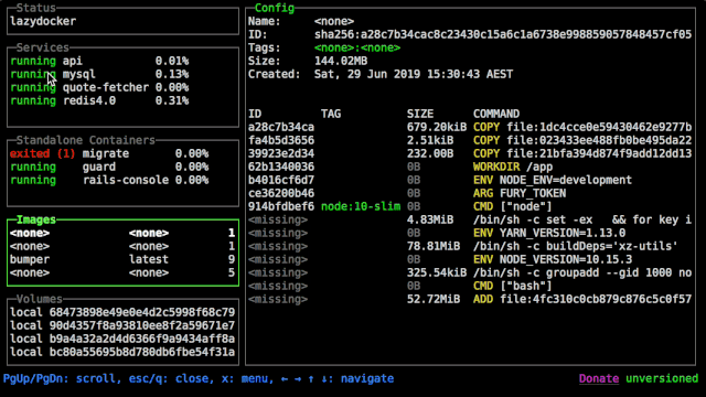 如果你认为ctop很酷,请你尝试使用 lazydocker 后再做决定!它是一个非常成熟的拥有终端 UI 界面的工具,提供了非常丰富的功能用于管理 Docker。这是我最喜欢的 Docker 管理工具!