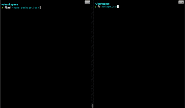 上面动图是 find 命令(左)和 fd 命令(右)的使用对比。