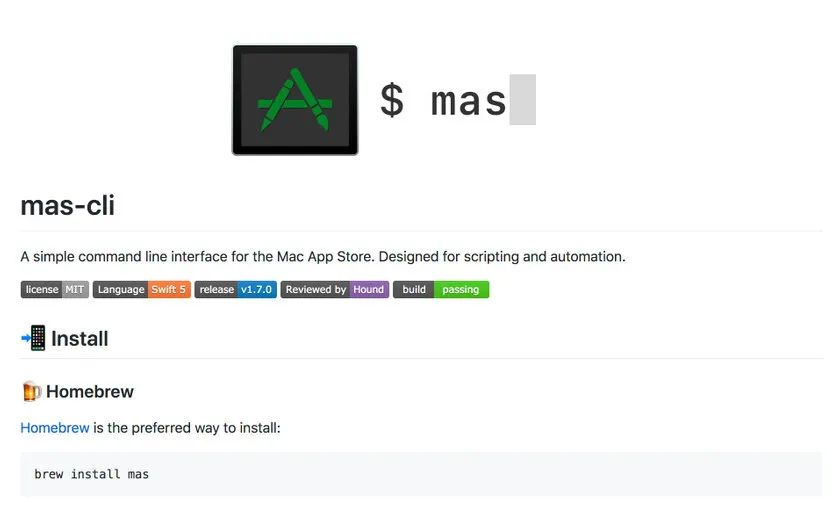 mas是一个用于从 App Store 安装软件的 CLI 工具。我目前为止,我仅仅使用过它一次——设置我的 Macbook 电脑软件。将来,我也将使用它来设置我的下一台 Macbook。mas可让你自动在 macOS 中安装软件。它解放了你大量的点击操作。而且,鉴于你正在阅读这篇有关 CLI 工具的文章,所以我大胆地认为,大家都和我一样,不喜欢无聊的单击操作。