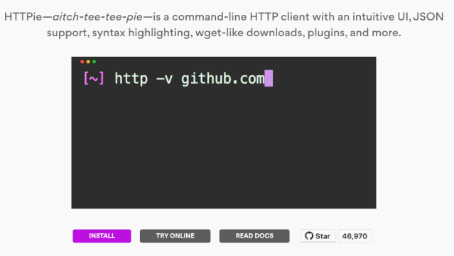 如果你需要发送一些 HTTP 请求,但发现使用curl不够直观,那么请尝试一下httpie。这是一款非常好用的curl替代工具。合理的默认配置以及简洁的语法使它更易于使用,命令返回也是彩色输出,甚至支持为不同类型的身份验证安装相应的插件。