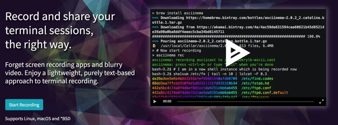 asciinema是可用于记录终端会话的工具。但是,与录制 GIF 不同,它可以让用户选择并复制这些录制中的代码!