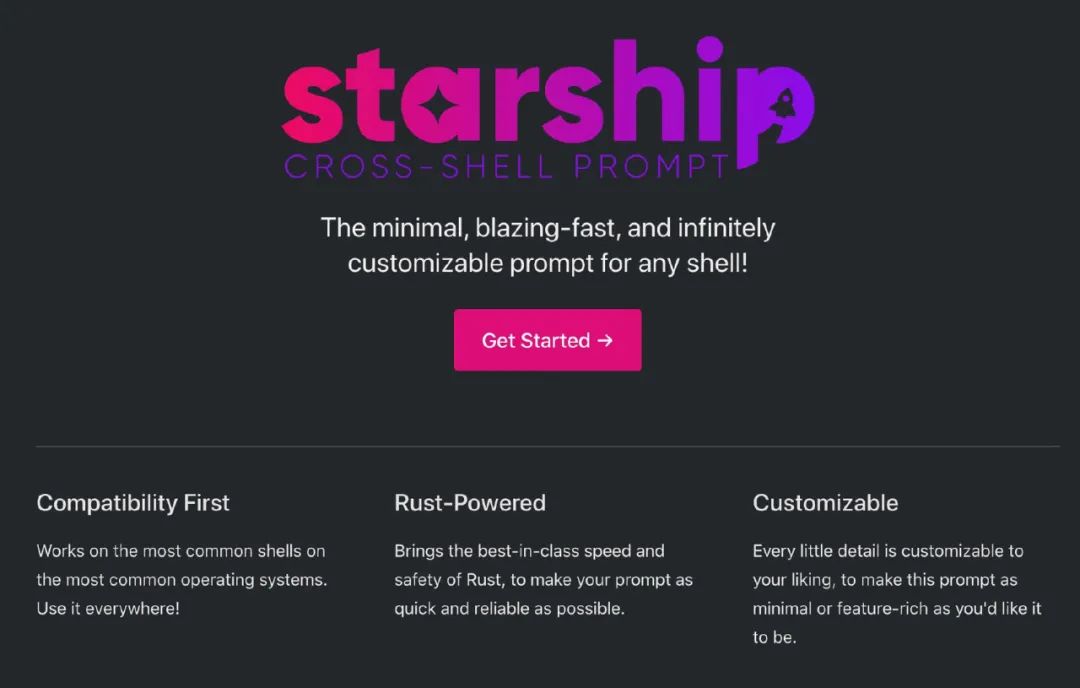 如果必须要从本篇文章中选择一个我最喜欢的终端工具——那非 Starship 莫属。Starship 可以适用于任何 Shell。你只需要安装它,然后在相应的配置文件.bashrc/.zshrc/config.fish添加一行配置,剩下的工作交给它来完成就好了。