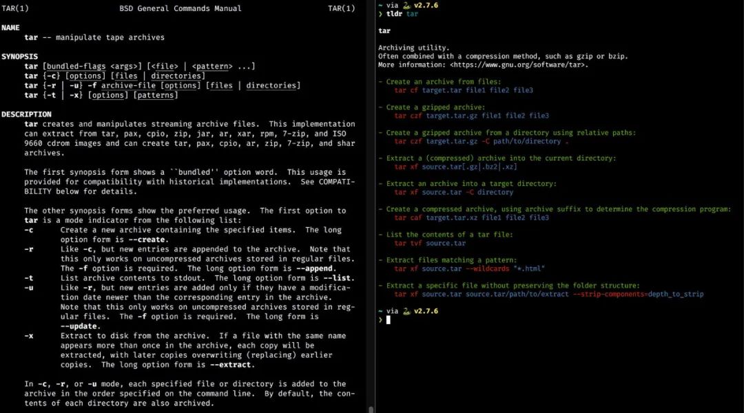 “man pages”展示的信息太全面了,但是很多时候使用tldr可以更快地帮你找到特定信息,这才是用户真正想要的。