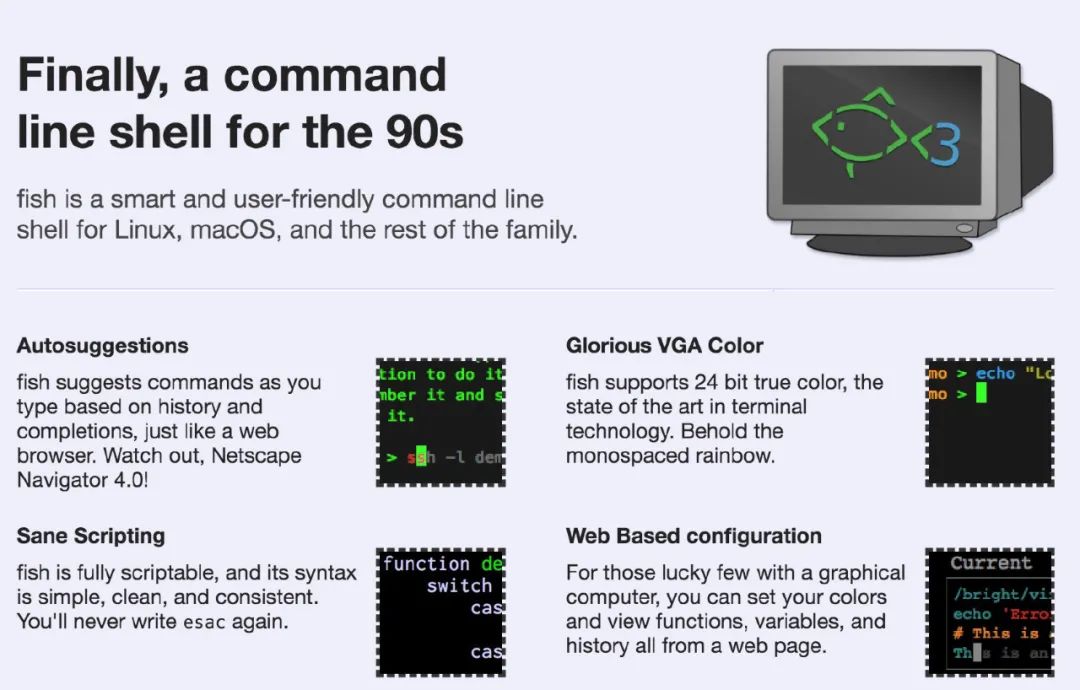 一方面,它非常适合初学者使用,因为使用者无需进行任何设置。另一方面,由于它使用的脚本语法与其他 Shell 有所差异,因此通常用户不能把拷贝自网上的脚本直接粘贴使用。你必须将不兼容的命令更改为合法的 Fish 脚本,或者启动一个 Bash 会话以运行 Bash 脚本。