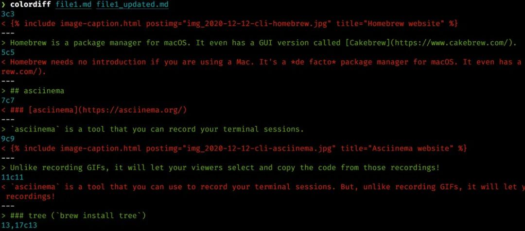 我很少在终端中使用diff操作(比较两个文件之间的差异),但是如果你需要执行这个操作,可以放弃使用diff命令,而是使用 colordiff。colordiff输出可以高亮显示,因此在查看文件差异内容时要方便得多,而不是在diff命令输出内容下,费力地查看所有的“ <”和“>”符号来对比文件差异。
