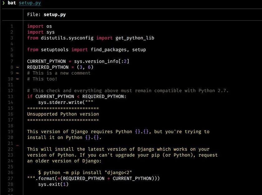 它增加了语法高亮显示,git gutter 标记(如果适用),自动分页(如果文件很大)等功能,并且使得输出的内容阅读起来更加友好。
