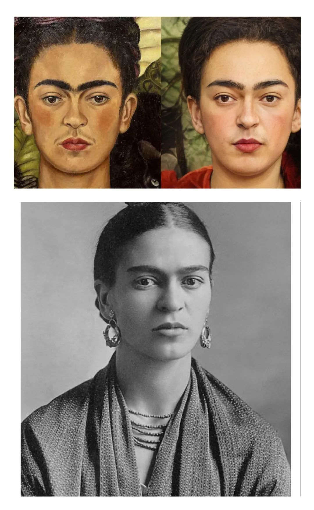 上:弗里达·卡罗的自画像(左)与转换后的「真人版」;下:弗里达·卡罗的照片。