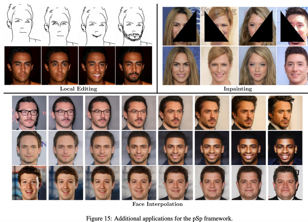 此外,为了更好地显示pSp框架的灵活性,研究者还展示了其在局部编辑、图像修复和人脸图像插值三种应用中的效果: